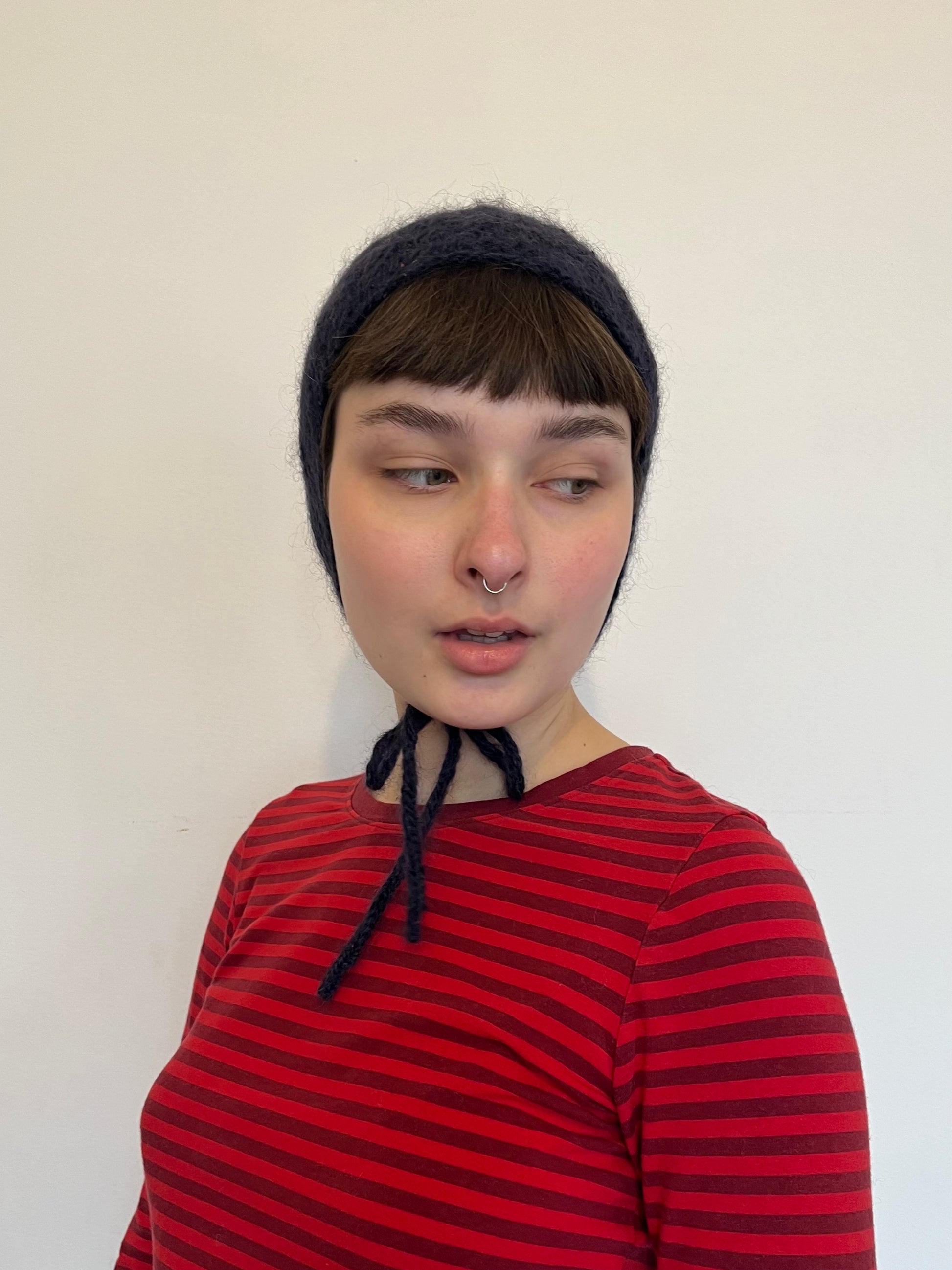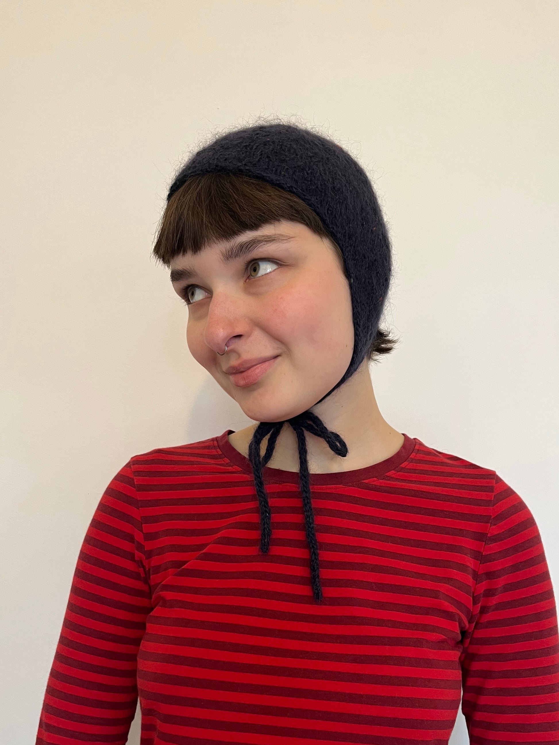 Hand-knit, this bonnet was made with 70% kid mohair and 30% mulberry silk yarn and 100% wool yarn