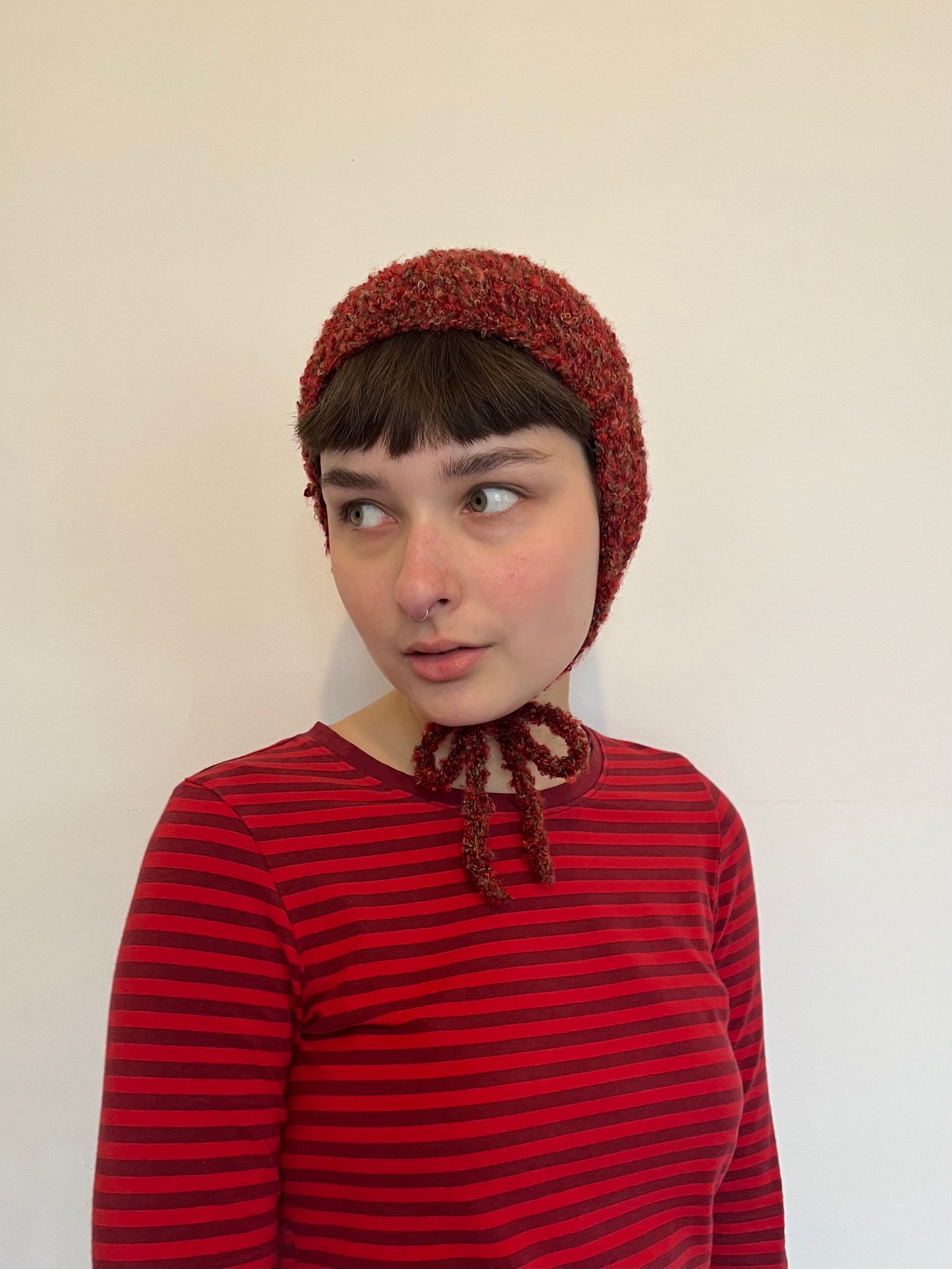 Hand-knit, this bonnet was made with recycled yarn. Unknown fiber content , might be a mix of natural and synthetic fibers